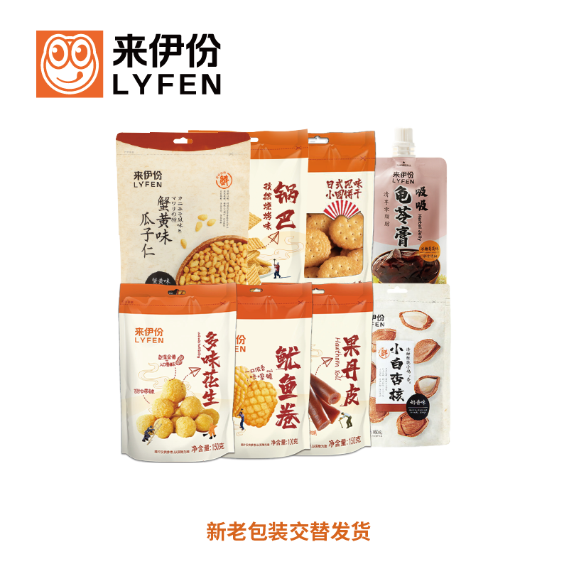 小白杏160g 多味花生150g 蟹黄味瓜子仁108g 孜然烧烤味锅巴100g 鱿鱼卷100g 果丹皮150g 日式风味小圆饼干(奶盐味)100g 吸吸龟苓膏(冰糖菊花味)253g