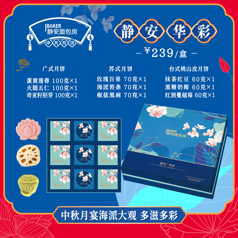 蛋黄莲蓉100g*1 火腿五仁100g*1 奇亚籽胚芽100g*1 玫瑰百果70g*1 海派苔条70g*1 椒盐黑麻70g*1 抹茶红豆60g*1 黑糖奶椰60g*1 红酒蔓越莓60g*1